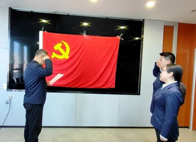 活动尾声,党委副书记带领第一党支部新入党党员两名同志在鲜红的党旗下庄严宣誓,并庄重地为他们把党徽佩戴在左胸上衣口袋上方正中位置,坚定的入党誓词和熠熠生辉的党徽更是让全体党员砥砺初心的坚定,汲取力量的奋进。